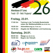 - Am Freitag, den 23.01.2026, steht allen Athleten die Turnhalle neben der Wettkampfstätte in der Zeit von 17.00 bis 20.00 Uhr für Trainingszwecke zur Verfügung.